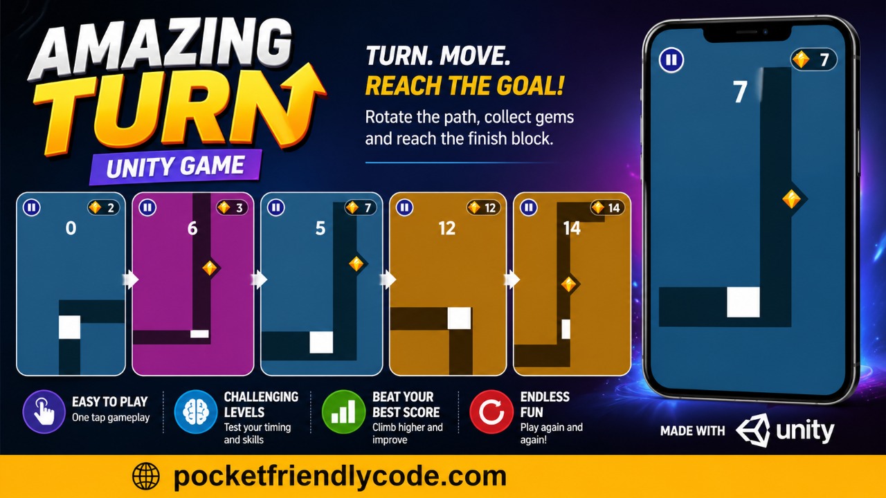 Amazing Turn is a professional Unity Game template for developers looking to quickly launch addictive hyper-casual mobile games. With its one-tap control scheme, this asset provides a foundation for a game that is easy to learn but hard to master. The complete Amazing Turn – Unity Game project gives you everything needed to build, customize, and publish a polished title, saving you invaluable development time.