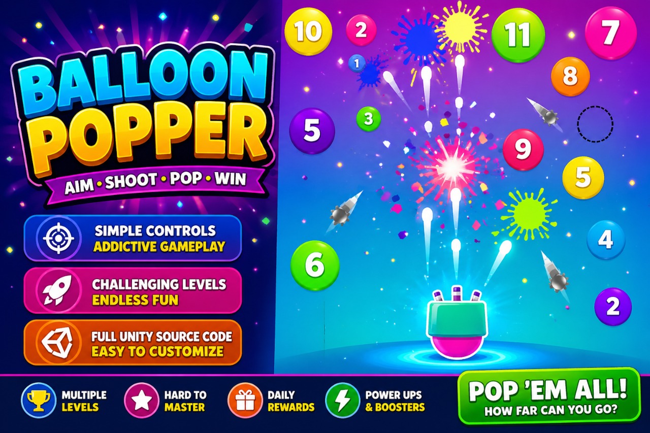 This template is an excellent tool for developers looking to rapidly prototype and publish a hyper-casual game. The classic Balloon Popper concept has universal appeal, ensuring your game can be enjoyed by players of all ages and skill levels. It also serves as a fantastic educational resource for those new to Unity, providing a clear, hands-on example of how a complete game is structured, from UI to game logic.