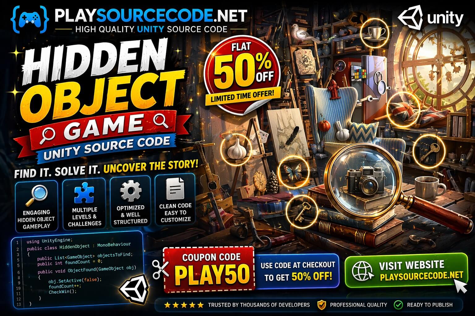 “Hidden Object Game is a top-trending Unity source code for a captivating hidden object game with stunning levels, beautiful graphics, and smooth animations. Designed to provide an engaging gameplay experience, players will search for hidden items in various scenes, progressing through challenging levels. The game comes fully integrated with AdMob ads, making it easy to monetize, and it’s optimized for mobile devices. It’s also easy to reskin, making it perfect for developers looking to create their own unique hidden object game.