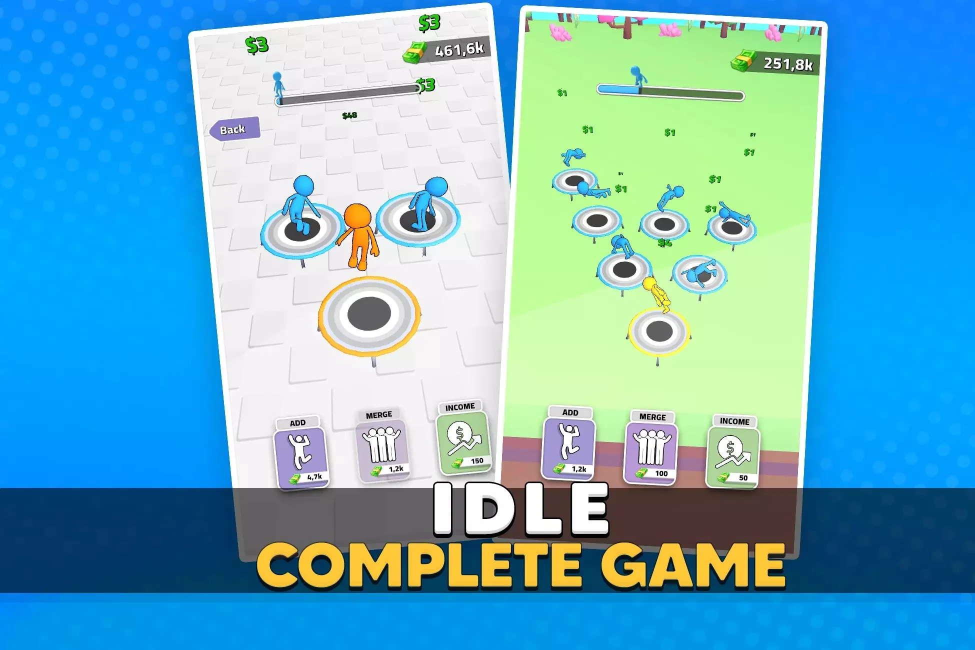 Bounce your way to success in Idle Trampoline, a unique idle game where characters earn money by jumping on trampolines. Merge characters to unlock higher levels, boost your income, and expand your growing trampoline empire.