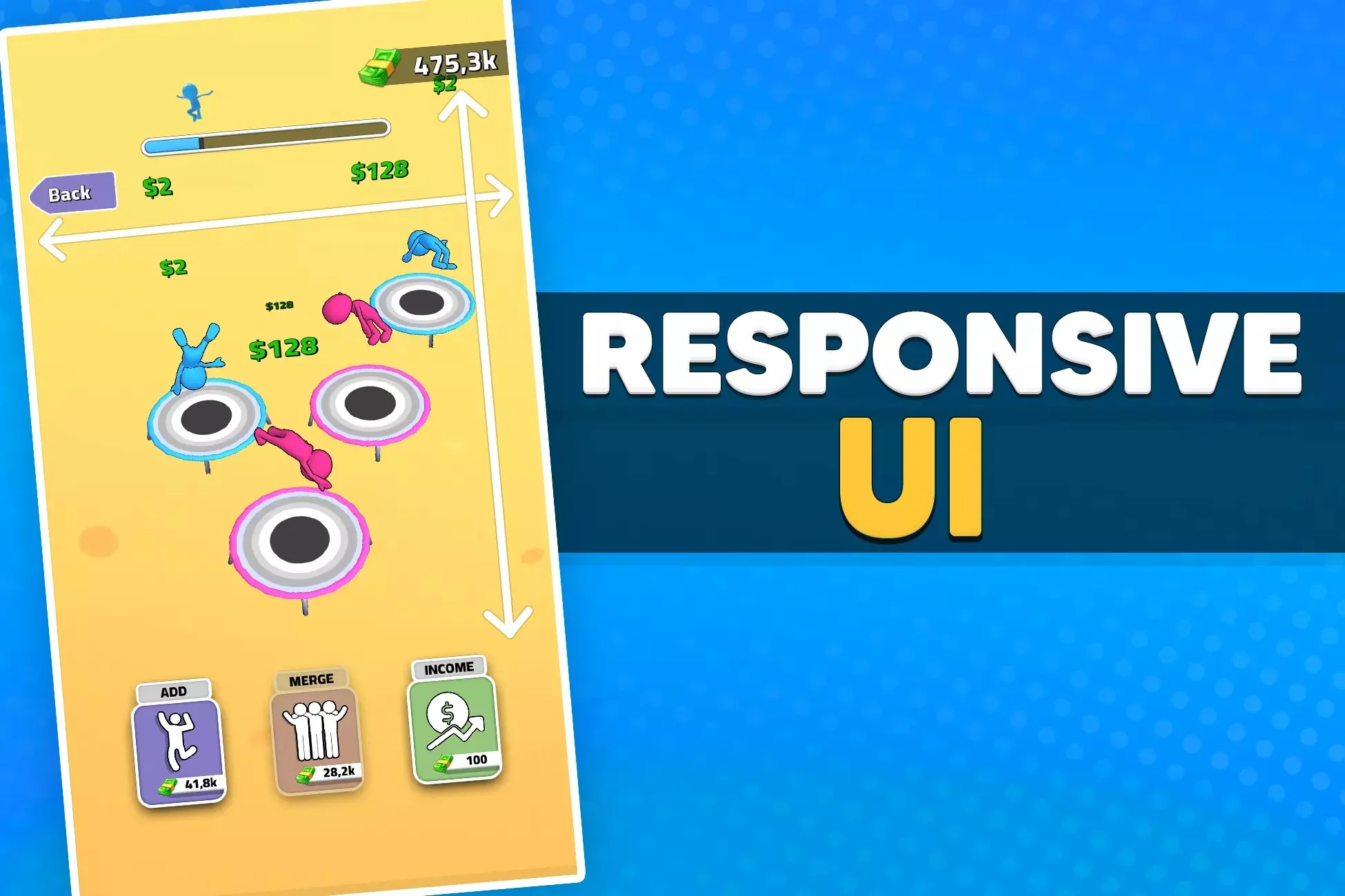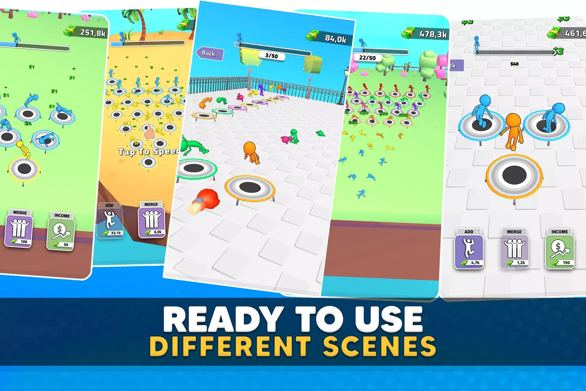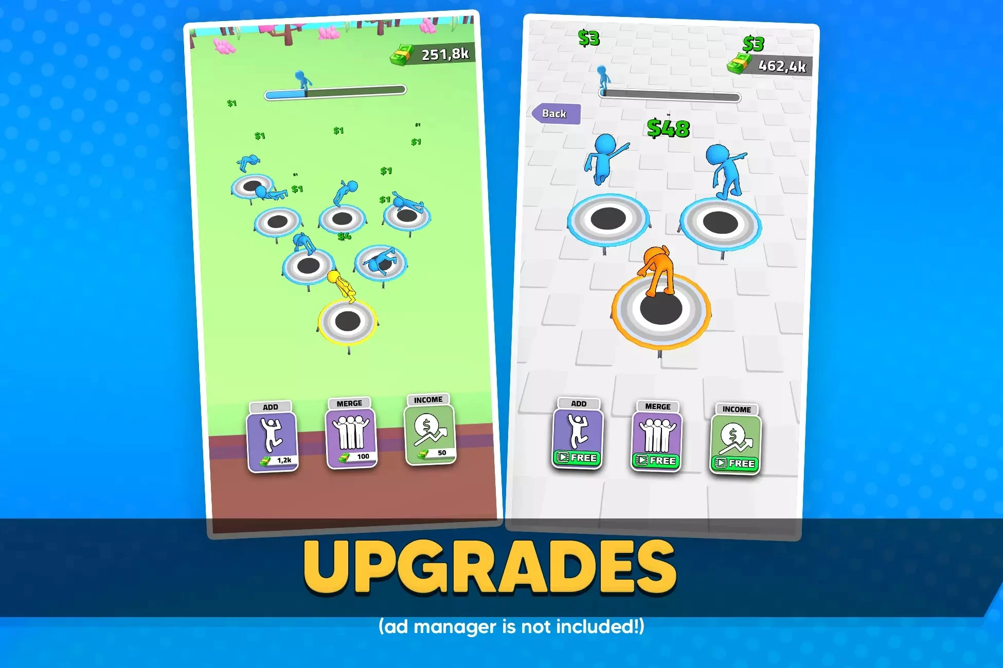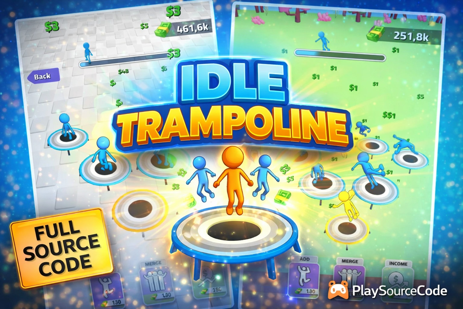 Build your trampoline empire in this fun idle game! Merge characters, earn money, and customize easily with Unity source code included.