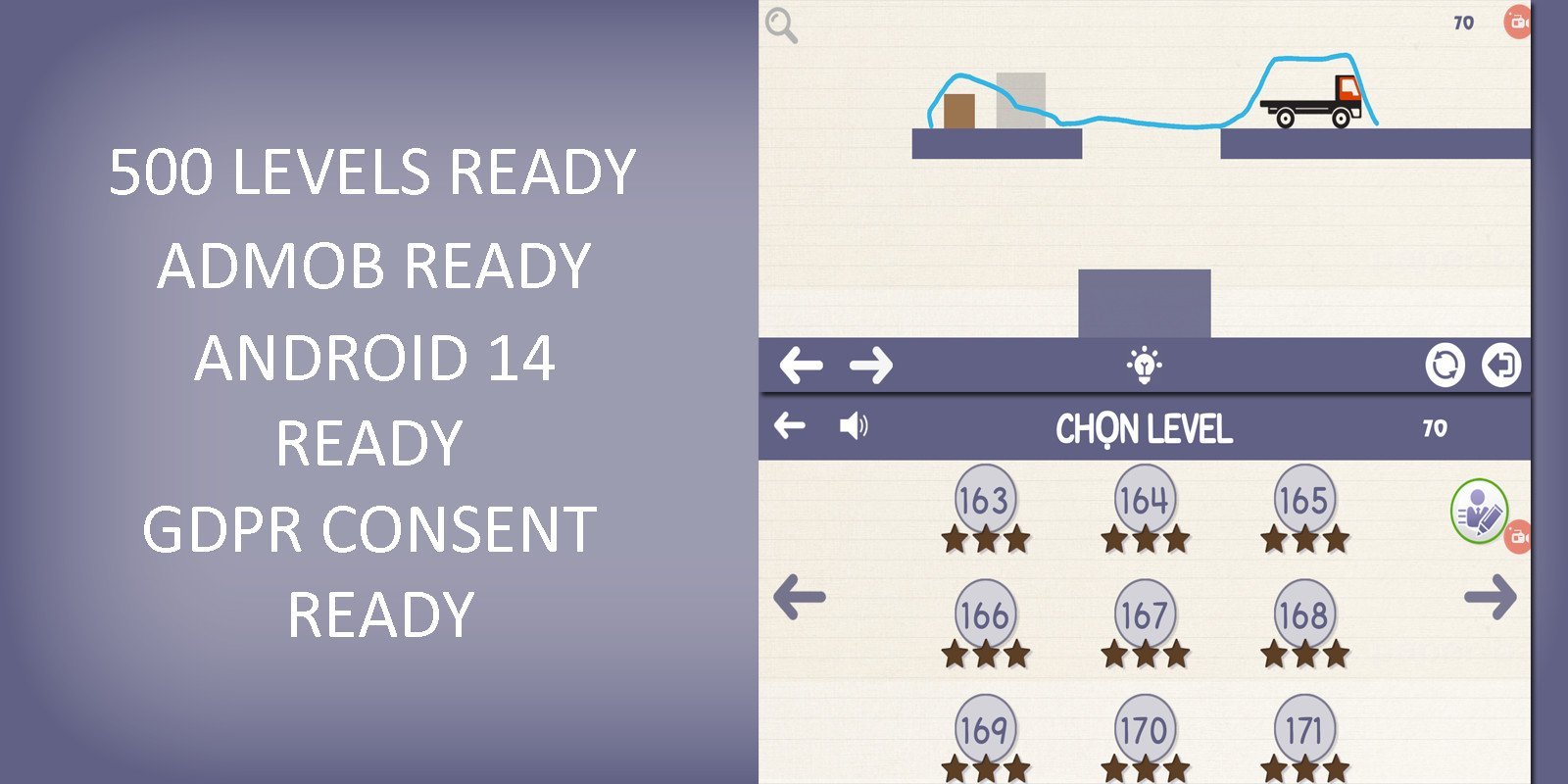 Simple, fun and addictive game play with many challenging levels, HD graphic, mobile control ready, very hard and interesting, your player will use left right button to move the truck and draw the line in order to move the box to its position to complete levels. You can change sprites to reskin it or use it as a template for your own game.