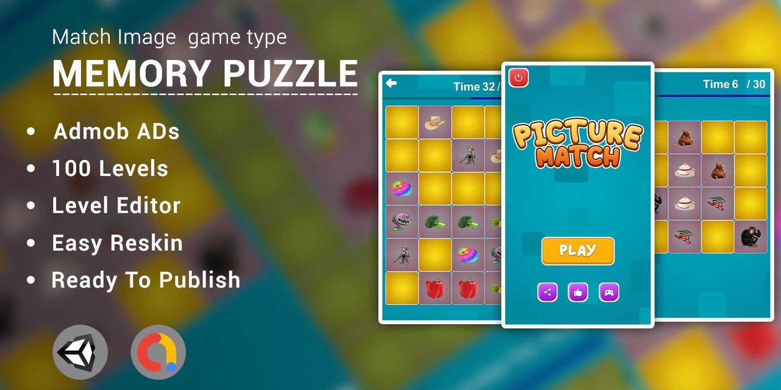 This Picture Match:Memory Puzzle template We made In detail and very easy to use for everyone And Can be reskinned into Something New ideas as well.
